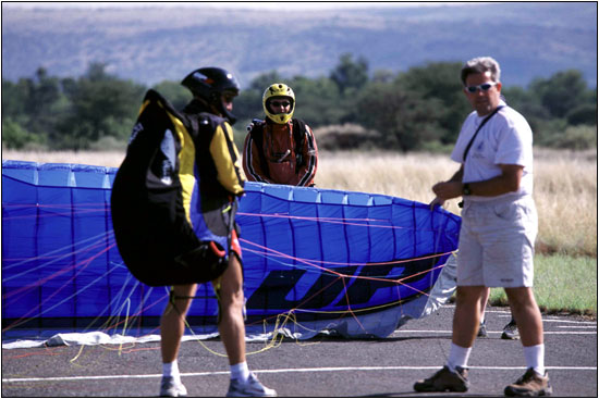 | Ermanno, Matteo e Marcello al decollo Ermanno indossa la nuova selletta di Woody Valley: la Velvet, che abbiamo collaudato a Kuruman, e vola il Summit2. da notare i cassoni che non sono chiusi ma di dimensioni ridotte |