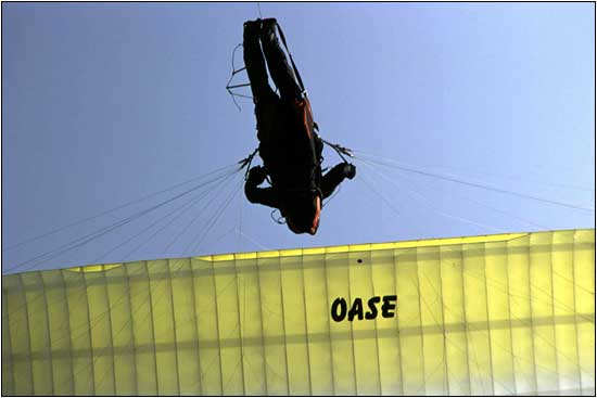 | Oase Oliver Rossel durante il traino. Olli volava con una selletta Fast2 di UP ma senza allacciare il pettorale; il grado di mobilitą era fuori dall'ordinario anche per piloti pił che esperti (la selletta prevede comunque delle cinghie per trattenere il busto del pilota alla seduta) |