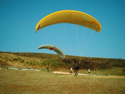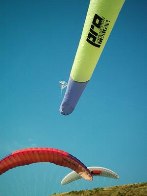 Poi, come se non bastasse, Sijor Maestro quel giorno mi ha fatto anche un regalo bellissimo...mi ha fatto usare la "Vela con le ciglia", bianca, tutta bordata di rosa, una vela "femmina" non c'è dubbio! Trovo carino manifestare la propria femminilità anche in cielo, non vi pare? :-) [la vela con le ciglia] Manu??? Chi è Manu??? Su??? Dove??? Insomma, da infarto...da non capirci più niente! E chi se lo aspettava? Sono rimasta per circa 5 secondi appanicata, poi mi sono detta alla Vitellozzo (do you remember Non ci resta che piangere?) "Bisogna reagire!". Faccio il fiocco e vela in spalla mi dirigo verso il paradiso... Dopo una sfacchinata che non avrei mai immaginato, arrivo al decollo. C'erano Gino, Alessio, GrazieMario, Permaflex, Moderateur. Dovevo aspettare che decollassero tutti... cavolo ...il cuore ha cominciato ad andarsene per i fatti suoi...ognuno di loro che partiva, lui batteva sempre più forte! Ho cominciato a fare domande a raffica per cercare di sciogliere la tensione. Del tipo: "ma se non riesco a sedermi??? e se non sento la radio??? e se... e se...???" A ripensarci adesso, mi sarei rotta le palle da sola a sentirmi! Invece tutti lì, carinissimi a rispondermi. Partono tutti...rimaniamo io e Permaflex. Renato mi da le ultime indicazioni, con una calma e una naturalezza da manuale...riesce a farmi stare tranquillissima nonostante la "sana" agitazione. Ok, sono pronta...parto, devo partire, Signore aiutami, Dio che bello, oddio me la faccio sotto, minkia...questi i miei pensieri prima del decollo. "Manu pronta al decollo!" ...e Sijor Maestro mi da il via. Parto, corro, la vela si gonfia, continuo a correre fino a che non sento che mi tira su... Oddio sto in cielo, sento il vento forte che mi viene contro, il rumore che fa la vela cigliata sopra di me, la voce rassicurante di Stortfinger...insomma mi sento a casa lassù e la prima cosa che ho pensato è stata: "Come si fa a vivere senza provare questo..., come ho fatto finora..." Come immaginavo, non sono riuscita a sedermi completamente! :-D Ringrazio mm° per non avermi detto via radio (come aveva fatto con altri) "Sembra che hai una scopa in culo", ma credo che non l'abbia fatto, solo perché sono una creatura di sesso femminile!!! :-) Mm° mi fa virare sinistra 90° e mi allineo per l'atterraggio. Visto che praticamente ero già in piedi, sono atterrata precisa precisa. Non mi sembrava vero, mi tremavano le mani, il cuore era pieno di gioia, felicità, adrenalina, di tutto un po'...diciamo che la sensazione più forte che ho provato è stata quella di un "ritorno alle origini", vale a dire che lassù ti senti più vicino a Dio, alle forze ancestrali della natura, all'umanità... E' bellissimo, da lasciarti senza parole. Poi sono tornata su di nuovo e ho fatto un secondo volo, atterrando a pesce (lunga in avanti!) e qualcuno (uno a caso...GM) mi ha fatto notare che l'atterraggio è stato morbido comunque, considerando i miei airbag naturali... Un'ultima cosa, questo volo l'ho dedicato (non so se i voli si possono dedicare come le canzoni, ma io l'ho fatto) ad una signora molto speciale che per fortuna quel giorno era in campetto e che mi ha sempre incoraggiato. Grazie Sijor Maestro, grazie Permaflex, grazie tutti (e poi dicono che il Parapendio è uno sport individuale!!!).