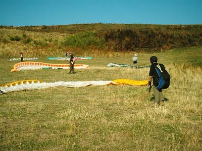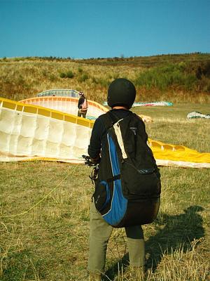 [destro, destro, destro...] Alla radio, Maurizio mi ha detto: 'Se non te la senti non si fa', ho risposto: 'See secondo te con tutta la fatica che ho fatto a salire mò scendo a piedi' (ma questa cosa l'ho sentita solo io, perché sono tuttora incapace di premere il tasto della radio!) E tutto questo subbuglio interno è appena iniziato che già ti ritrovi a correre, la meraviglia del panorama, immobile e costante, tutto intorno come a proteggerti, e la prima cosa che ti stupisce quando ti stacchi dal suolo è quanto sia naturale, tutto il timore svanisce e lascia il posto ad una sensazione di grande armonia. Non c'è alcuna violenza, nessuno strappo brusco, niente urti né rumori, pensi che non sia vero, che sia irreale… non può sembrare così naturale volare…. Al posto delle vertigini un po' temute, la scoperta di una nuova dimensione; invece della sensazione di stare nel vuoto, la bellissima e nuova consapevolezza della potenza dell'aria, che ti culla e ti porta con dolcezza; persino la posizione - seduta - impone rilassatezza… E fare il primo volo con quel tramonto, da togliere il fiato. Ti guardi intorno e non ci credi, poi atterri e pensi che il rischio maggiore sia prenderci troppa confidenza, nulla di quello che hai intorno sembra poterti tradire. Insomma non è una scarica d'adrenalina, che brucia in fretta e svanisce con l'atterraggio. E' molto meglio: è una sensazione intensa di pienezza che ti invade gradualmente, come un innamoramento. Ed è solo cominciato. Grazie Maurizio, grazie Simona, grazie a tutti ragazzi.