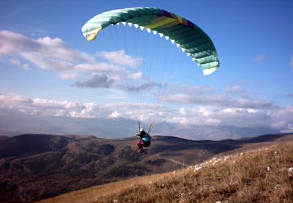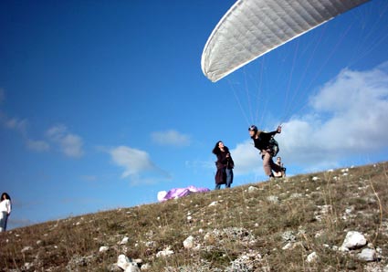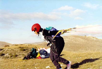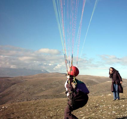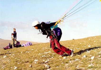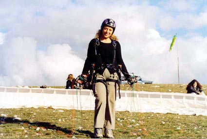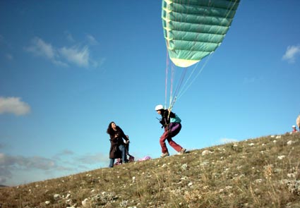 [summit II] Subito dopo il breafing con sijor maestro, con il cuore in gola e le palpitazioni già a duemila, cominciamo ad aprire le vele. Stavolta Stort mi ha fatto provare una nuova vela, un'Ozone bianca (eh si! BIANCA!!!), leggera e lunghissima. Forse per me quella è stata una giornata di "Grandi amori" ...colpo di fulmine pure con la vela! :-D In decollo avevamo l'assistenza di Chiara (moglie di Danilo), in atterraggio quella di Mauri. La prima a partire è Silviamariarita, decollo ok, sembra quasi tranquilla...una grande! [braccia basse...] [spingo sul petto...] [controllo...] [evvìa!] [speranzacostanzapazienza, 39 kg di allieva coreana...] [scp] [scp] [scp] Neanche il tempo di rendermi conto di questa realtà, che il cuore comincia la sua danza frenetica dentro di me...primo istinto: girarmi e fare il fiocco alla vela. E invece... [manu] [viaviavia!] E' un'implosione di emozioni che non riesco controllare, non parlo di agitazione o paura, parlo di pace, di serenità, d'immenso. Mi guardo intorno e il paesaggio che dal decollo mi era sembrato statico e sfumato, comincia a plasmarsi, prende in ogni momento forme diverse cambiando continuamente prospettiva e colore in base alla luce del sole. Non è facile spiegare la magia di come ci si senta amalgamati al Tutto lassù, anche l'aria sembra cambiare consistenza, ho avuto la sensazione che fosse più densa, quasi riuscivo ad assaporarla, era come se penetrasse in me. Ho alzato la testa e ho guardato la vela che mi sosteneva il corpo e l'anima e l'ho ringraziata per questo, con tutto il rispetto che ho potuto, visto che Lei è come un compagno esigente... A differenza dei voli in campetto, che sono molto brevi, qui ho avuto modo di pensare e di sentire tutto questo "mentre" ero lassù in completa armonia con quel Tutto di cui parlavo e non c'è paragone... L'atterraggio è stato abbastanza morbido, sono riuscita a non sedermi (era una sfida con me stessa!) anche se ci è mancato poco...:-) Sono corsa verso Stort e con l'entusiasmo di una bambina l'ho ammazzato di abbracci e di bacini... lui ancora ride ed io, nonostante la pioggia di questi giorni, continuo a zompettare quà e là... Innamorata cronica. [speranza, dani, manu, gm]