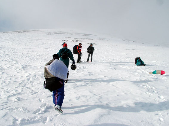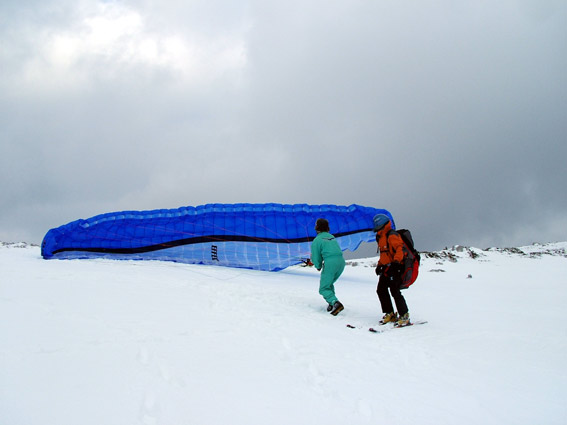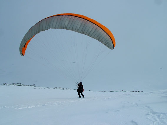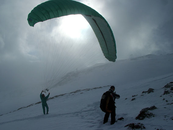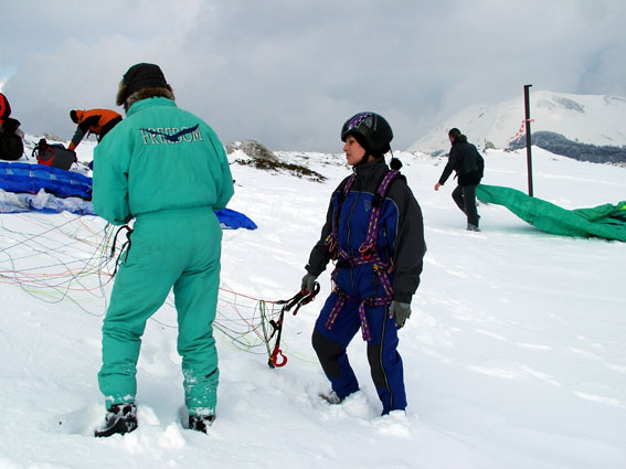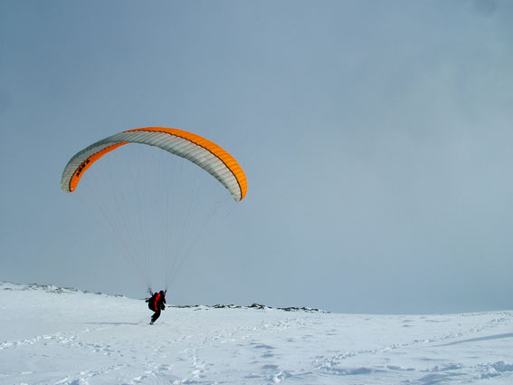 Primavera? 18 04 2005 ![]() [neveneveneve] Le foto sono state scattate quest'inverno a Campo Catino. Anche lì tanta neve. Primovoloaltouno Se è vero che bisogna commentare il primo volo per evitare la sfiga, voglio farlo anch?io, anche se non riesco a descrivere le emozioni del volo a parole posso provare con quelle che ho provato appena arrivati sul pendio. La sensazione tutta mia, nasce dal basso ventre e mi scuote tutto, fino al cervello quando arriva è inconfondibile, fin da bambino mi ha fatto cacciare nei guai più strani che tu possa immaginare, una fatale attrazione verso il pericolo e il proibito che genera una irresistibile spinta a provare e non riesco a pensare a null'altro fino a che non lo ho fatto. Mi tornano in mente le planate che facevo sorretto dal grande ombrello da pastore di mio padre, lanciato per le ripide scale di Oricola o quando ho paracadutato il gatto( per fortuna non me stesso) dalla torre. Questa volta però, è possibile fare questa esperienza in tutta sicurezza grazie dalla pratica di un buon istruttore e non certo dai miei 31 anni. Qualcuno si lamenta per l'assenza di vento: "sarà solo una planatina?!" Per me và più che benee man mano che gli altri decollano la sensazione cresce e cresce la voglia di lasciare la terra e volare oltre la via Flacca come un uccello, libero verso il mare???.. Aiuto penso di essere nel pieno della sindrome da ?pollo impazzito?. Finalmente è il mio turno, adrenalina al massimo e via! Per quanto riguarda il volo vero e proprio non riesco proprio a descrivere ed allora ci pensa come sempre il fluido rosa. "In distanza una ghirlanda nera avvolge il punto di non ritorno volo fantastico sul campo ventoso immobile, solo, i miei sensi: un vortice Un'attrazione fatale m'afferra improvvisa, come posso sfuggire alla stretta irresistibile? Non posso staccare gli occhi dal cerchio dei cieli ammutolito ruota uno spiazzato essere terreno: io. Si forma ghiaccio in punta alle mie ali avvertimenti trascurati, pensavo d'aver pensato a tutto non ho navigatori a ricondurmi a casa Scarico, vuoto e tramutato in pietra anima tesa che impara a volare condizionata ma ben determinata a tentare non posso staccare gli occhi dal cerchio dei cieli ammutolito ruota uno spiazzato essere terreno: io sopra il pianeta, un'ala e una preghiera mio sporco alone, scia di vapore nell'aria vuota tra le nubi vedo la mia ala in volo dall'angolo dell'occhio luminoso sogno immune dalla luce del giorno potresti lanciare quest'anima oltre il tetto notturno non trovo un termine di paragone animazione sospesa o stato d'ecstasi non so distogliermi dal cerchio dei cieli ammutolito, spiazzato, ruota un essere terreno: io"