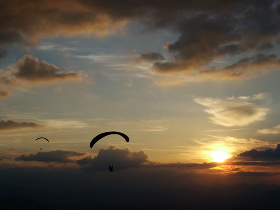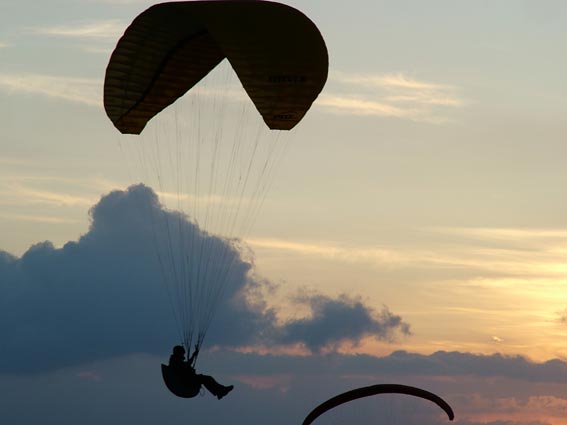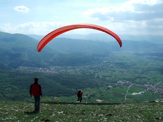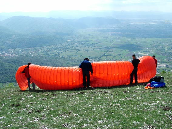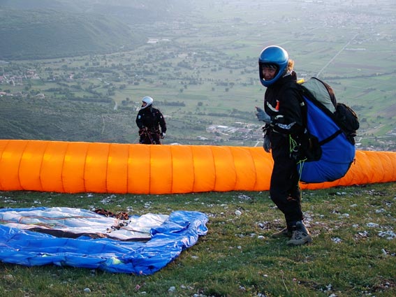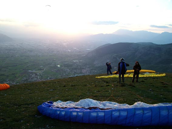 Gioiagioiagioia sosteneva, tesi e illusioni... 18 05 2005 ![]() [vento] L’indomani avverto mia moglie dicendo: "Per la cena ci sarò, stai tranquilla, arriverò entro le 21 !!!!". Prendo la moto per non avere problemi di traffico al ritorno, appuntamento a Tivoli, arrivo a Gioia prima all’atterraggio e poi al decollo verso le 15. Vento sostenuto e tutti gli allievi in attesa del momento giusto “tanto il vento prima o poi cala” ed infatti al tramonto, dopo le 20, arriva il tanto sospirato momento… ovviamente sapevo di avere un serio problema familiare da risolvere, visto che entro le 21 non potevo essere certo a casa, ma decido di concentrarmi solo sul volo !!!! Devo confessare che ero un po’ teso durante la snervante attesa, ma poi quando il maestro ha fatto il briefing ed il momento si è avvicinato, la tensione ha lasciato il posto alla determinazione di fare un bel volo e di rimanere concentrato per evitare errori o manovre maldestre, avevo selletta e vela mai provati prima, ma poco importava; gli altri cominciano a partire rapidamente ed anche il maestro decolla con il suo biposto ed io, con l’assistenza di Costola, mi dichiaro pronto a partire. Sono tanto sicuro di me che Costola non capisce che sono al mio primo volo alto (ed il genio si guarda bene dal comunicarglielo... n.d.r.), infatti mi chiede: “Ma tu come preferisci partire?” ed io tranquillo: “Parto alla francese anche se ora il vento calato”... Alzo la vela, controllo, stabilizzo, mi giro e parto; in un attimo sono in aria aspetto di allontanarmi dal costone e poi mi assesto nella selletta e sono pronto a godermi il volo. Sono lì compiaciuto e sorpreso di come sono rilassato, quando all’improvviso dalle due radio che avevo sento il maestro che dice: “Ma come Lucio è partito... è il suo primo volo doveva aspettare che fossi a terra, così lo potevo assistere in atterraggio!” e poi: “Cosa fai Lucio mi stai venendo dietro... NON mi seguire da così vicino!!!!“ ed io che già immaginavo la situazione d’emergenza, con i Pompieri ad aspettarmi all’atterraggio con la pista inondata di schiumogeni... ma che dico???? Rimango tranquillo, seguo le istruzioni, mi godo il tramonto, mi avvicino dritto alla zona di atterraggio e comincio il circuito (che immaginavo più difficile). Tutto a posto. Nel frattempo il maestro è atterrato e prende ad assistermi e... ultimo colpo di scena, mi avverte che c’è un inversione, il vento è cambiato e che mi devo spostare verso la testa della pista, o “il tappo della bottiglia” ed io tranquillo vado e mi preparo all’atterraggio e... le ultime parole del maestro: “Ricordati di avere le gambe!!!” infatti era tanta la voglia di rimanere ancora in volo, che tardo a mettermi in posizione eretta, ma poco male... sono a terra!! Finita l’ebbrezza del volo ritorno alla dura realtà, sono le 20:45, la cena a Roma sta iniziando... telefono felice e dico: “Mi dispiace, tranquilli, arriverò per il dolce !!!” e mi avvio velocemente, mentre sento in lontananza un coro: “Lucio crumiro... Lucio crumiro ... Lucio crumiro” era Cicognona che esternava così il mio abbandono degli amici dopo il mio primo volo alto... Grazie maestro. Grazie a Tutti.