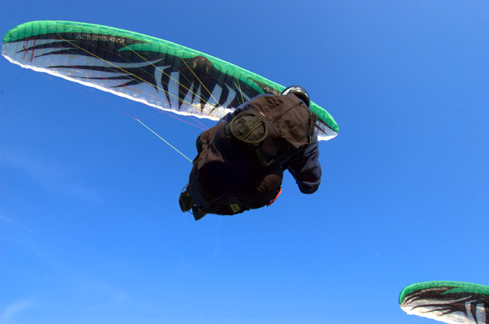 La mia prima SAT 13 04 2007 [acrominator, la sciabola di gründhammer...] Succede che un mio ex allievo molto bravo e motivato decide di fare un corso SIV sul Garda sotto la supervisione di Michael Nesler. Per la cronaca Nesler oltre ad essere uno dei più abili disegnatori di profili alari a livello mondiale è anche un acrobata da levarsi tanto di cappello, ed è, insieme alla sua compagna Gudrun, test pilot del DHV. Decido di andare anch’io a quel corso. Noi istruttori, a volte, per il solo fatto di essere tali pensiamo di aver imparato tutto. Invece non è così. L’evoluzione è continua e bisogna stare al passo con le nuove tecniche. C’è sempre qualcosa di nuovo da imparare per poi poterlo trasmettere ai nostri ragazzi. Quindi ogni tanto bisogna ridimensionarsi e rimettersi in discussione se vogliamo continuare a crescere e progredire come professionisti. Arriviamo sul Garda in giugno. Il posto (Malcesine) è semplicemente fantastico. Vado a visitare il decollo: un prato immenso (con mucche mangiaparapendii comprese) dove potrebbero decollare 100 persone simultaneamente. La vista è stupenda ed il sapere che tra poche ore sarei decollato da quel luogo mi dava un’emozione quasi tangibile. Incontro Nesler. L’avevo già conosciuto in passato ad un corso istruttori (lui era relatore) ma era stata una conoscenza fugace. Il personaggio è un sacramento alto 1.90 che parla con una voce con uno strano accento e con una cadenza che agisce sulle menti da tranquillante. Subito chiarisce che se non mi vede fare stalli e uscite da negativo fatte come Cristo comanda ...col cavolo che mi fa fare la SAT. Bene, apprezzo la sua serietà... era proprio quello che cercavo. Non è merce facile da trovare oggigiorno. Primo volo, decollo, ho anni di esperienza dietro le spalle ma ho il cuore in gola. Arrivo sulla verticale del centro lago. Il lago che è enorme da 1500 metri sembra una misera pozzanghera. C’è un traghetto sotto di me di quelli che portano decine di turisti e da quassù sembra poco più di una barchetta a remi. Arriva la voce di Nesler nell’auricolare “direzione sud”, mi fa mettere contro vento. Io sono un personaggio molto pratico e sto molto coi piedi per terra (si fa per dire) ma quella voce strana, lenta, cadenzata ha il potere magico di calmarmi e di darmi determinazione e sicurezza. Dopo qualche frontalone esagerato fatto coi comandi agganciati e le bretelle “A” tirate a “bestia” l’omone mi fa fare uno stallo trattenuto, esco, altro stallo e ancora un altro. Ho altezza da vendere e sotto di me c’è un gommone con tre esperti a bordo pronti in caso di caduta in acqua a recuperarmi. Dopo i full stall Nesler vuole vedere i negativi (quelli veri non gli stalli asimmetrici che spesso vengono spacciati per negativi). Va bene lo faccio, negativo trattenuto per circa tre giri completi poi la vite negativa rallenta e via, uscita in stallo di comandi. Bella roba. Non l’avevo mai fatto. Non avevo mai osato in precedenza a fare oltre un giro di negativo. Bella cosa. E quanta esperienza acquisita. Si continua così per tutto il giorno e dopo ripetute salite in funivia e nuovi salti Nesler si convince che il nostro gruppo può permettersi qualcosa di più: la SAT. Non sto nella pelle il sapere che l’indomani avrei fatto quella manovra. L’ho studiata per mesi. Ho visto 100 filmati della manovra. Ho studiato la dinamica della Sat nei minimi dettagli ma solo ora capisco che ero mille miglia lontano dall’immaginarmi cosa in realtà sia la manovra. Ci avviamo in decollo e da istruttore mi aspettavo che Nesler ci facesse una “capa tanta” con la descrizione della manovra ed invece niente, chiama la Gudrun e questa in due parole e l’aiuto di un simulatore ci spiega l’esecuzione. Vado in volo e sono contrariato. Io ad un mio allievo lo avrei ammazzato dalle spiegazioni tecniche se avessi dovuto spiegarli la SAT e loro invece niente due paroline e VAI. Durante il volo e l’avvicinamento alla verticale del lago ero aggredito da innumerevoli dubbi. E una vocina all’orecchio sussurrava: "ma chi te lo fa fare". Niente. Arrivo sulla verticale altissimo. Il gommone di soccorso gironzola sotto di me e la sua vista è rassicurante. Entra in radio quella solita “voce camomilla” “Ok Mirco direzione sud se mi senti fai le orecchie”. Faccio le orecchie ed ancora quella voce... quella voce ha il potere di darmi energia, grinta e determinazione. Se me lo avessero raccontato non ci avrei creduto non sono certo un mistico e credo solo a quello che tocco con mano (purtroppo). Mi fa entrare in vite positiva e ad un preciso momento quando la vela ha quella esatta energia e quella esatta inclinazione Nesler scocca un secco: "ORA... VAI!". Non perdo un millisecondo siamo in gioco e allora giochiamo. Un ritardo o un anticipo della manovra potrebbero portarmi ad entrare in altra configurazione e dover poi fare uno stallo totale per resettare il tutto. La sensazione è di quelle che non hai mai vissuto. Sto girando violentemente di schiena la pressione che esercito sulle bretelle esterne è forte quasi mi piega il braccio ma devo mantenere assolutamente il peso spostato dalla parte opposta. E’ semplicemente ...incredibile sono in SAT ...al primo tentativo. Pochi giri e Nesler mi fa uscire: vuole che controlli immediatamente la vela non c’è tempo per autocomplimentarsi. La vela esce violenta ma pulita. In pratica come un’uscita da una vite positiva tirata. Ho appena il tempo di rincalzarmi nella selletta e subito sento la voce: direzione sud... subito... ancora SAT. E via altra entrata in SAT e poi ancora un'altra. La quota di sicurezza non manca certo. Nell’ultima SAT rimango come attaccato al comando continuando a spingere sugli elevatori... che succede? ...non voglio uscire ...è troppo bello. Entra in radio la voce di Nesler che probabilmente capendo il fiume di adrenalina che mi si sta agitando in corpo interviene tra il divertito e l’ironico dicendo: “Ben