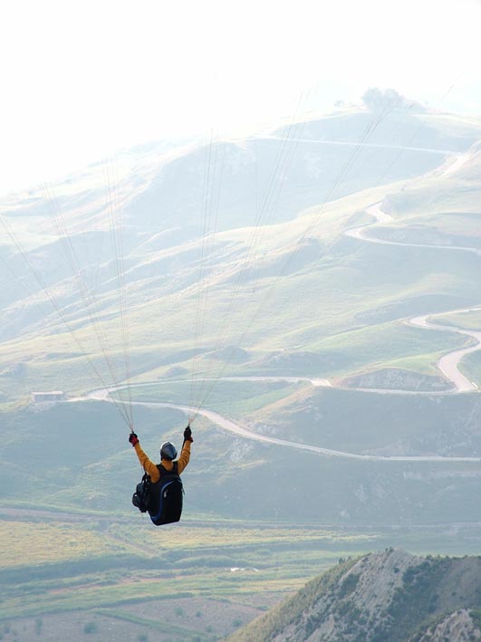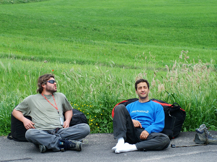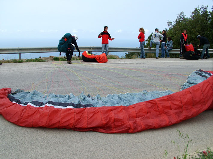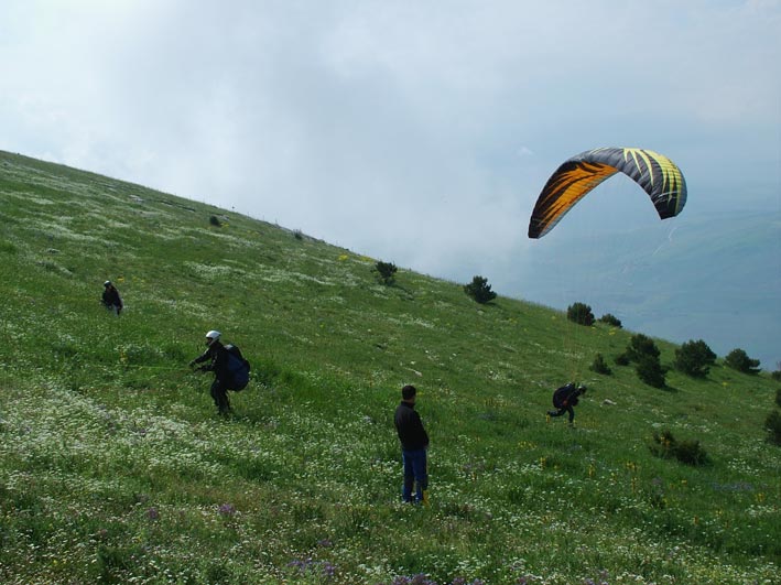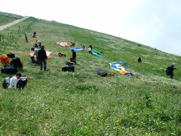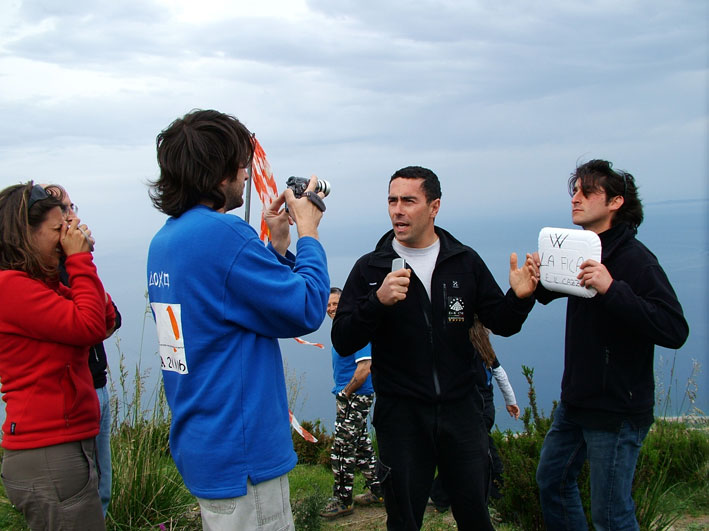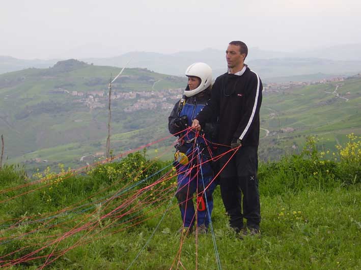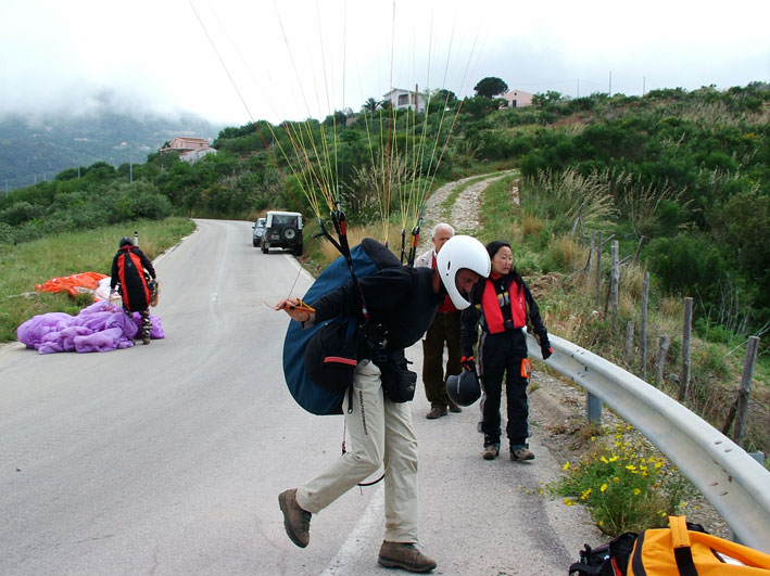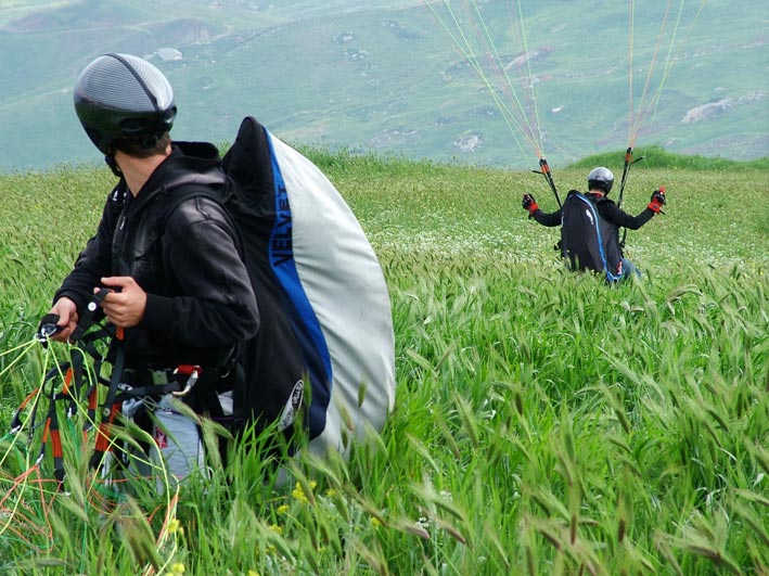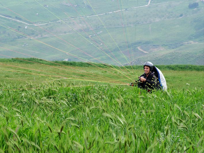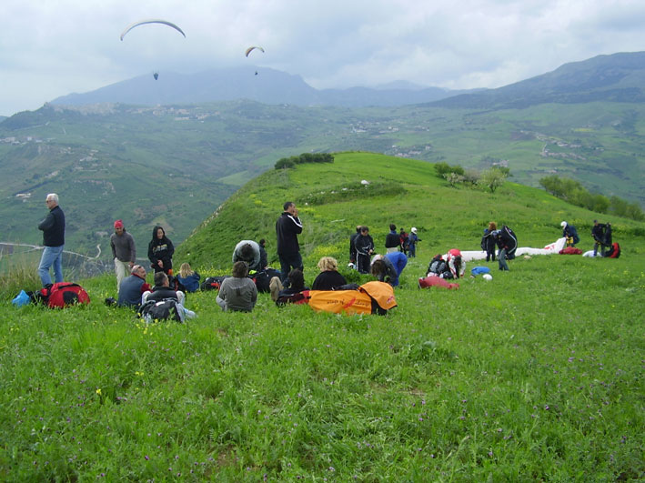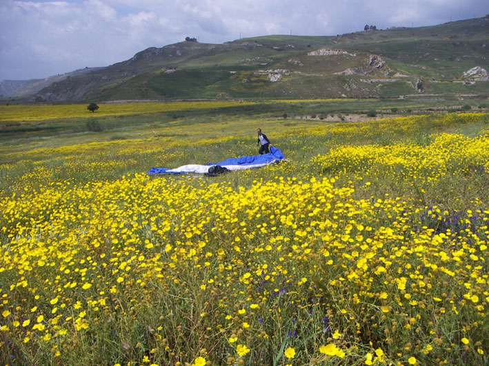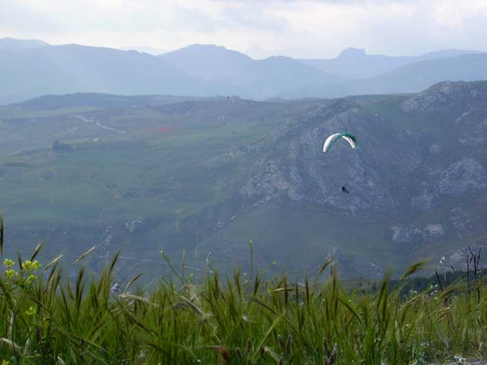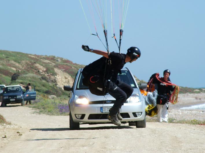 FLAITUR SICILIA 2007 - DIARIO DI BORDO "cannoli e cassoni... cordini e cazzoni" 18 05 2007 [è l'alba, arriva il traghetto] Finalmente ci siamo! Dopo mesi di attesa, organizzazione, aspettative, progetti, il giorno della partenza è arrivato. Appuntamento sotto scuola alle 13,30. A Voltzz diciamo le 13 chè sennò fa tardi..... Uno dopo l'altro arriviamo tutti, col sorriso a cinquantaTRE' denti stampato sulla faccia.... Dopo solo (!!!!) un'ora e mezza siamo già (!!!) in direzione Napoli. Ma non in autostrada...... Che sei matto? Noi cose normale mai! Ci facciamo la Flacca, stile processionarie, con una velocità degna del collega Bradipo. Questo perchè? Viene da chiedersi.... Semplice, il Nostro Vizioso Signore Maestro voleva una bufala.... ehmmm... la mozzarella intendo.... E quindi tappa obbligata a Mondragone... Insomma dopo solo (!!!) sei ore arriviamo a Napoli. Eppure mi ricordavo che erano 200 km... Devono essere aumentati a causa dell'inquinamento.... E una volta lì, una cosa stranissima: c'e' un traffico pazzesco! Mai vista una cosa simile! Il traffico a Napoli... Bah.... La nave e' bellissima e nuovissima! Le cabine, di prima classe, spaziose e comode... da veri signori... Se non fosse per la cena in pieno stile tribù di parapendio... Sì perchè mentre la maggior parte di noi sale sulla nave, due eroi, Iglù e Culatello, si scapicollano a comprare le pizze per tutti e riescono a convincere quel povero pizzaiolo a farne ventitrè in 15 minuti, chè sennò la nave parte senza di loro.... Il momento dell'arrivo sulla nave, con tutte quelle pizze, è clamoroso... Una partita di football americano... I due eroi si fanno largo a spallate tra la folla affamata-impazzita, pronti a difendere con la vita il tesoro conquistato...... Ci accampiamo sul ponte, al freddo e al gelo, tra i passanti impietositi, a mangiare con mani, piedi e chi più ne ha più ne metta, con l'olio gocciolante sui pantaloni e le macchie di pomodoro sulle magliette.... Vabbè tanto 'sta settimana nessuno ci farà caso alle patacche... Con lo stomaco pieno di pizza e mozzarella di bufala, satolli ed allegri, ce ne andiamo nelle cabine a goderci l'ultima notte in un vero letto. Sicilia, l'abbiamo detto tante volte, ma stavolta è vero, stiamo proprio arrivando! [la nave bellissima e le pizze buonissime] [sul ponte, subito dopo la partenza] 1° giorno - domenica 29 aprile Arriviamo a Palermo alle SEI del mattino!!!! Ma porca vacca, dico io, che fretta c'era? Non poteva andare più piano 'sta nave? Appuntamento a Mondello con i nostri amici Vincenzo e Francesca... Mondello..... Che incanto!!! Un gioiello sul mare in mezzo ad una distesa sconfinata di colline verdi..... Colazione abbondante, come è d'uso… Raggiungiamo il Nostro Signore Maestro Locale, il mitico Adriano Patti, e il Flaitur ha finalmente inizio. Ci dirigiamo verso Agrigento. Il primo decollo e' dal Monte Kumeta, 1200 mt slm: un pendio così pieno di fiori non l'avevo ancora visto... Che bello! Peccato per l'atterraggio..... Tutto fango!!! Ne usciamo con le scarpe talmente piene che pesano 3 kg l'una... Però arriva subito una bella ricompensa: i cannoli più buoni che abbia mai assaggiato in tutta la mia vita! Una vera delizia.... E, dopo questo carico di energia (hai voglia!), ci avviamo verso un nuovo sito di volo non distante: Serra della Moneta, 1150 mt slm. Maestro Adriano litiga un po' col vento, gli lancia qualche insulto tipico locale, e finalmente si decolla.... Sul pendio e' evidente che l'erba non la taglia nessuno... Praticamente durante il gonfiaggio ce l'hai nelle orecchie... E poi l'atteraggio.. E qui, se si avesse un briciolo di dignità, si stenderebbe un velo pietoso... A vederlo dall'alto sembra un infinito tappeto verde atterrabile... Se se... Alla fine l'unico punto atterrabile e' un campo di grano spiaccicato, come dopo l'atterraggio degli ufo, stretto, lungo e pieno di gobbe... Quali gobbe? Gobbe, gobbe. Peraltro la lunghezza a qualcuno non e' bastata... Vero Gino? La prima giornata fly e' finita: un successo! Grazie alle doti meteo di maestro Adriano siamo riusciti a beccare l'unica zona col sole di tutta l'Isola! E ora un'altra ricompensa: la luculliana cena che soddisfa anche i palati più esigenti. Infine il campo nomadi. Con molta velocità si montano le tende, si gonfiano i materassini, si aprono i sacchi a pelo... Si dorme. E si russa. La prossima notte ci vorrà un piano anti-russaggio. [mondello] [portella della ginestra, uomini e furgoni] [monte kumeta, ci si prepara] [monte kumeta, primo decollo siciliano] [monte kumeta, primo decollo ultimo] [monte kumeta, un nuovo alieno nel cielo] [serra della moneta vs ada] [serra della moneta vs gemello #1] [serra della moneta vs gemello #2] [serra della moneta vs gemello #3] [serra della moneta vs gemello #4] [serra della moneta vs gemelli, riproviamo #1] [serra della moneta vs gemelli, riproviamo #2] [serra della moneta vs ramazza] [serra della moneta vs santissimi] [serra della moneta vs atterraggio stile nimitz] 2° giorno - lunedì 30 aprile Neppure oggi si dorme... Qualcuno ha deciso che alle sette e' ora di alzarsi... Je possino! Tre quarti d'ora di curve per la colazione e si parte. Oggi il tempo e' sfavorevole, dobbiamo girare un po' per vedere se troviamo un posto dove si riesca volare. E così passiamo la mattina in giro per l'agrigentino alla ricerca disperata. Quà non c'è vento. Là c'è un cumulo. Là è troppo a rischio. Oggi sta vincendo lui, il tempo dispettoso. Allora per consolarci ci buttiamo in un supermercato a comprare di tutto di più e, idea meravigliosa, si mangia accampati selvaggiamente (capirai che novità....) su una bellissima spiaggia. Poi si riparte alla ricerca del decollo perduto..... E ancora una volta maestro Adriano vince: il posto lo troviamo, è il più bello di tutti quelli visti finora! Attraversiamo immensi prati e campi di grano.... Sembra quasi un posto irreale.... Passo Funnutu, 430 mt slm. Il decollo è molto gradevole, l'atter