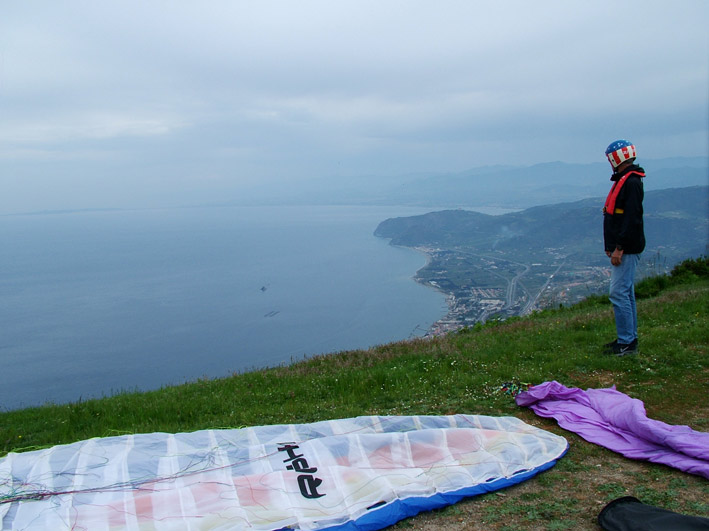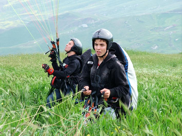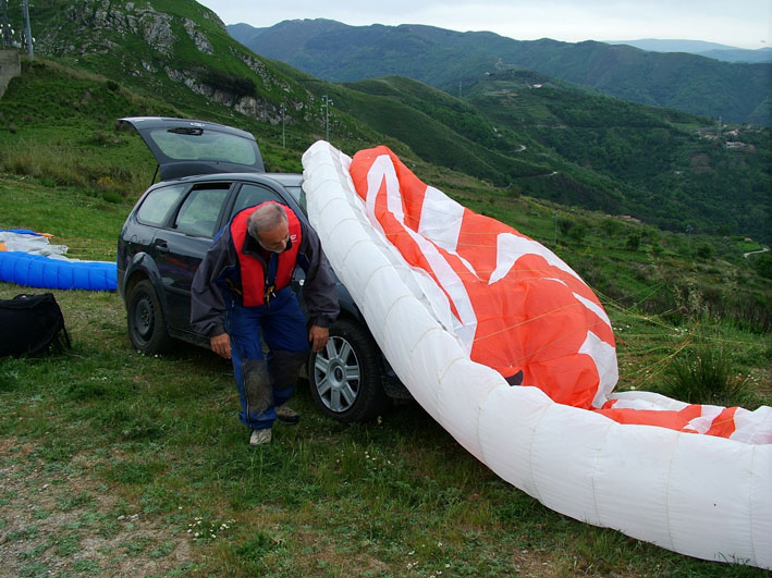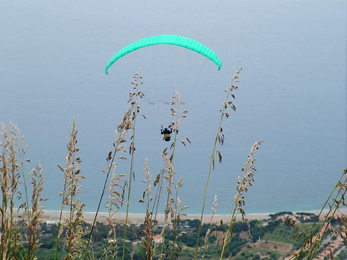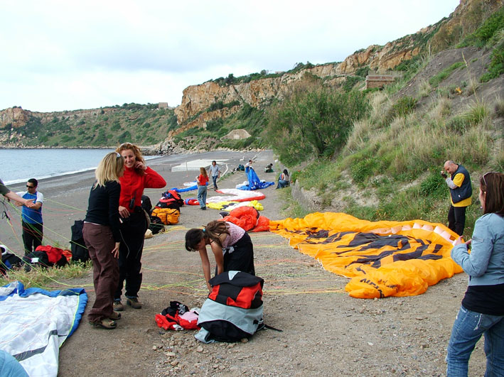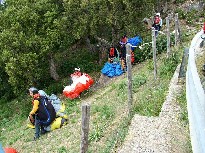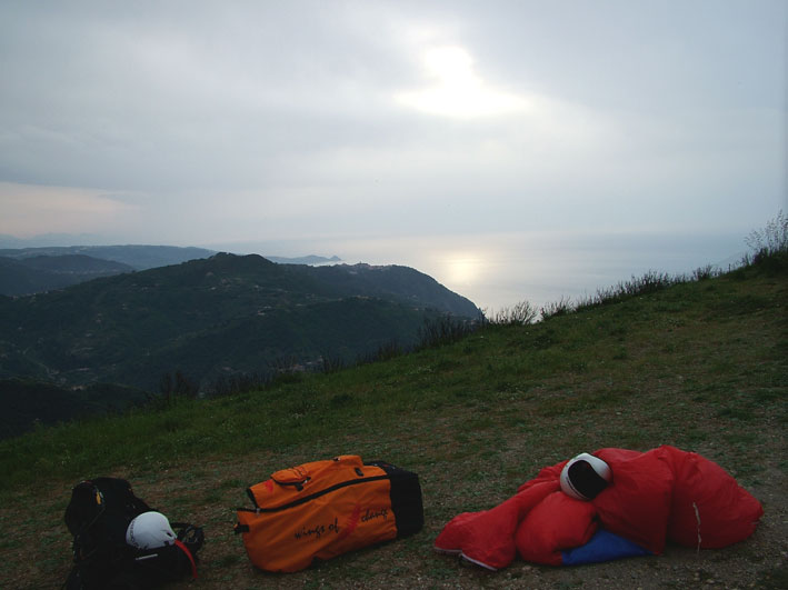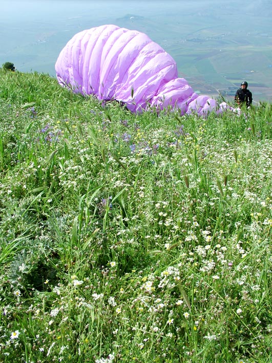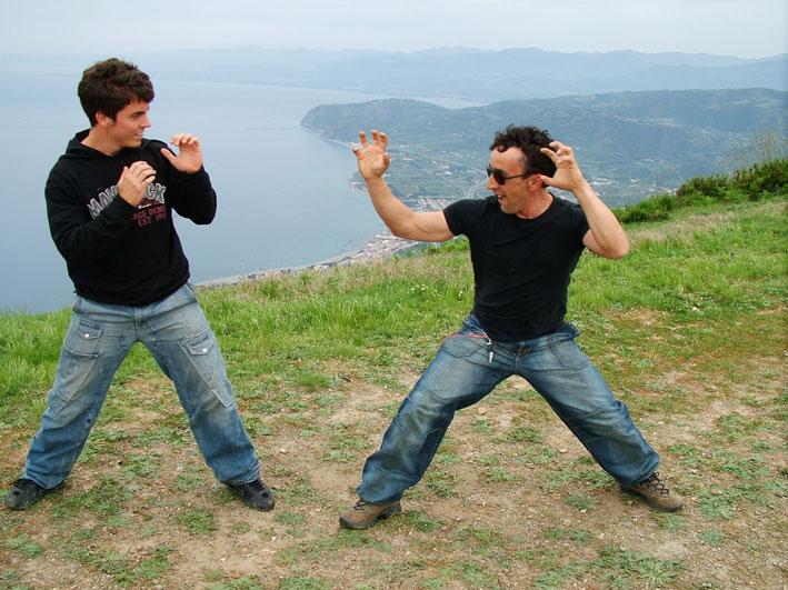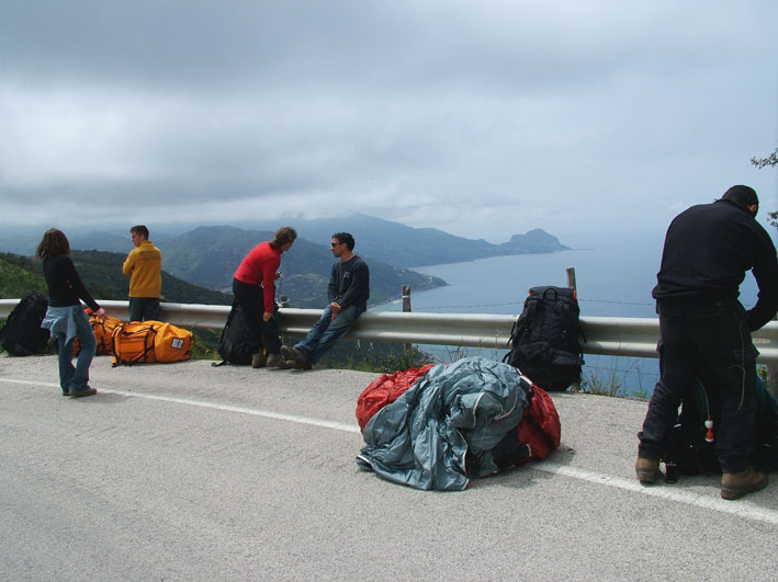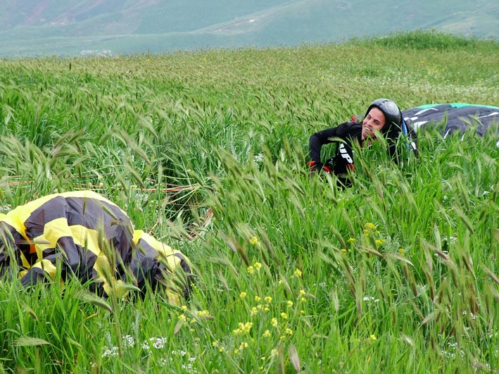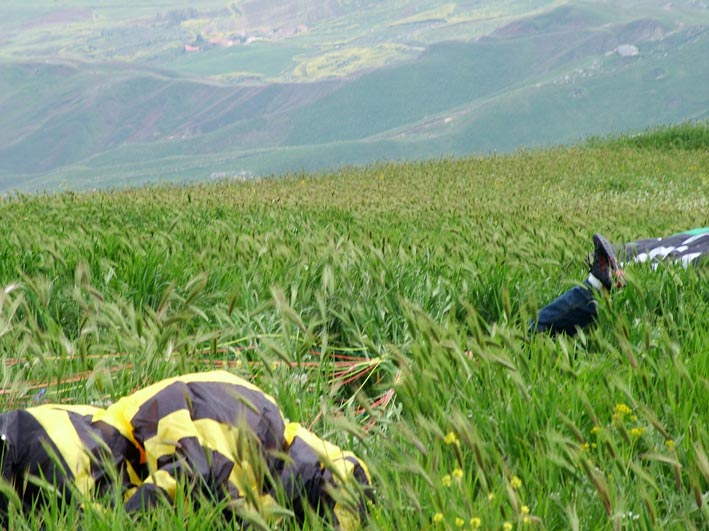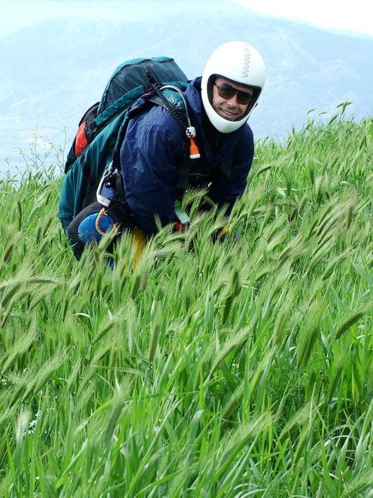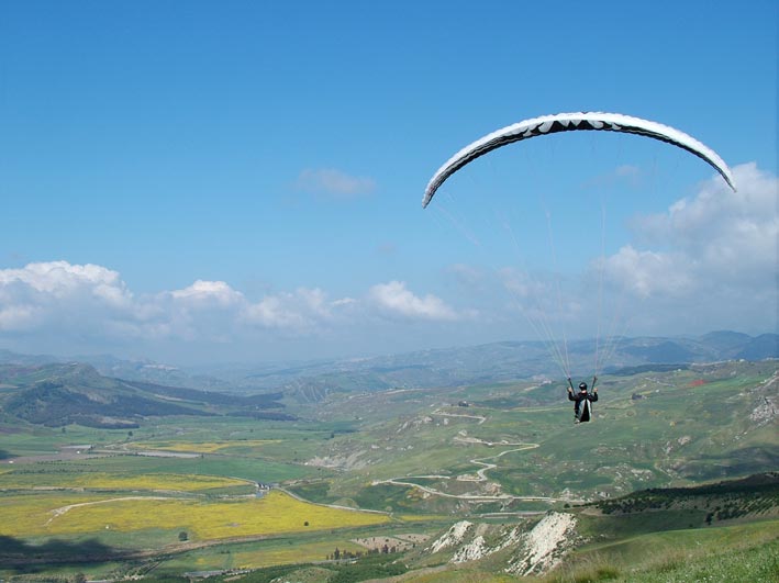 FLAITUR SICILIA 2007 - DIARIO DI BORDO "cannoli e cassoni... cordini e cazzoni" 18 05 2007 [è l'alba, arriva il traghetto] Finalmente ci siamo! Dopo mesi di attesa, organizzazione, aspettative, progetti, il giorno della partenza è arrivato. Appuntamento sotto scuola alle 13,30. A Voltzz diciamo le 13 chè sennò fa tardi..... Uno dopo l'altro arriviamo tutti, col sorriso a cinquantaTRE' denti stampato sulla faccia.... Dopo solo (!!!!) un'ora e mezza siamo già (!!!) in direzione Napoli. Ma non in autostrada...... Che sei matto? Noi cose normale mai! Ci facciamo la Flacca, stile processionarie, con una velocità degna del collega Bradipo. Questo perchè? Viene da chiedersi.... Semplice, il Nostro Vizioso Signore Maestro voleva una bufala.... ehmmm... la mozzarella intendo.... E quindi tappa obbligata a Mondragone... Insomma dopo solo (!!!) sei ore arriviamo a Napoli. Eppure mi ricordavo che erano 200 km... Devono essere aumentati a causa dell'inquinamento.... E una volta lì, una cosa stranissima: c'e' un traffico pazzesco! Mai vista una cosa simile! Il traffico a Napoli... Bah.... La nave e' bellissima e nuovissima! Le cabine, di prima classe, spaziose e comode... da veri signori... Se non fosse per la cena in pieno stile tribù di parapendio... Sì perchè mentre la maggior parte di noi sale sulla nave, due eroi, Iglù e Culatello, si scapicollano a comprare le pizze per tutti e riescono a convincere quel povero pizzaiolo a farne ventitrè in 15 minuti, chè sennò la nave parte senza di loro.... Il momento dell'arrivo sulla nave, con tutte quelle pizze, è clamoroso... Una partita di football americano... I due eroi si fanno largo a spallate tra la folla affamata-impazzita, pronti a difendere con la vita il tesoro conquistato...... Ci accampiamo sul ponte, al freddo e al gelo, tra i passanti impietositi, a mangiare con mani, piedi e chi più ne ha più ne metta, con l'olio gocciolante sui pantaloni e le macchie di pomodoro sulle magliette.... Vabbè tanto 'sta settimana nessuno ci farà caso alle patacche... Con lo stomaco pieno di pizza e mozzarella di bufala, satolli ed allegri, ce ne andiamo nelle cabine a goderci l'ultima notte in un vero letto. Sicilia, l'abbiamo detto tante volte, ma stavolta è vero, stiamo proprio arrivando! [la nave bellissima e le pizze buonissime] [sul ponte, subito dopo la partenza] 1° giorno - domenica 29 aprile Arriviamo a Palermo alle SEI del mattino!!!! Ma porca vacca, dico io, che fretta c'era? Non poteva andare più piano 'sta nave? Appuntamento a Mondello con i nostri amici Vincenzo e Francesca... Mondello..... Che incanto!!! Un gioiello sul mare in mezzo ad una distesa sconfinata di colline verdi..... Colazione abbondante, come è d'uso… Raggiungiamo il Nostro Signore Maestro Locale, il mitico Adriano Patti, e il Flaitur ha finalmente inizio. Ci dirigiamo verso Agrigento. Il primo decollo e' dal Monte Kumeta, 1200 mt slm: un pendio così pieno di fiori non l'avevo ancora visto... Che bello! Peccato per l'atterraggio..... Tutto fango!!! Ne usciamo con le scarpe talmente piene che pesano 3 kg l'una... Però arriva subito una bella ricompensa: i cannoli più buoni che abbia mai assaggiato in tutta la mia vita! Una vera delizia.... E, dopo questo carico di energia (hai voglia!), ci avviamo verso un nuovo sito di volo non distante: Serra della Moneta, 1150 mt slm. Maestro Adriano litiga un po' col vento, gli lancia qualche insulto tipico locale, e finalmente si decolla.... Sul pendio e' evidente che l'erba non la taglia nessuno... Praticamente durante il gonfiaggio ce l'hai nelle orecchie... E poi l'atteraggio.. E qui, se si avesse un briciolo di dignità, si stenderebbe un velo pietoso... A vederlo dall'alto sembra un infinito tappeto verde atterrabile... Se se... Alla fine l'unico punto atterrabile e' un campo di grano spiaccicato, come dopo l'atterraggio degli ufo, stretto, lungo e pieno di gobbe... Quali gobbe? Gobbe, gobbe. Peraltro la lunghezza a qualcuno non e' bastata... Vero Gino? La prima giornata fly e' finita: un successo! Grazie alle doti meteo di maestro Adriano siamo riusciti a beccare l'unica zona col sole di tutta l'Isola! E ora un'altra ricompensa: la luculliana cena che soddisfa anche i palati più esigenti. Infine il campo nomadi. Con molta velocità si montano le tende, si gonfiano i materassini, si aprono i sacchi a pelo... Si dorme. E si russa. La prossima notte ci vorrà un piano anti-russaggio. [mondello] [portella della ginestra, uomini e furgoni] [monte kumeta, ci si prepara] [monte kumeta, primo decollo siciliano] [monte kumeta, primo decollo ultimo] [monte kumeta, un nuovo alieno nel cielo] [serra della moneta vs ada] [serra della moneta vs gemello #1] [serra della moneta vs gemello #2] [serra della moneta vs gemello #3] [serra della moneta vs gemello #4] [serra della moneta vs gemelli, riproviamo #1] [serra della moneta vs gemelli, riproviamo #2] [serra della moneta vs ramazza] [serra della moneta vs santissimi] [serra della moneta vs atterraggio stile nimitz] 2° giorno - lunedì 30 aprile Neppure oggi si dorme... Qualcuno ha deciso che alle sette e' ora di alzarsi... Je possino! Tre quarti d'ora di curve per la colazione e si parte. Oggi il tempo e' sfavorevole, dobbiamo girare un po' per vedere se troviamo un posto dove si riesca volare. E così passiamo la mattina in giro per l'agrigentino alla ricerca disperata. Quà non c'è vento. Là c'è un cumulo. Là è troppo a rischio. Oggi sta vincendo lui, il tempo dispettoso. Allora per consolarci ci buttiamo in un supermercato a comprare di tutto di più e, idea meravigliosa, si mangia accampati selvaggiamente (capirai che novità....) su una bellissima spiaggia. Poi si riparte alla ricerca del decollo perduto..... E ancora una volta maestro Adriano vince: il posto lo troviamo, è il più bello di tutti quelli visti finora! Attraversiamo immensi prati e campi di grano.... Sembra quasi un posto irreale.... Passo Funnutu, 430 mt slm. Il decollo è molto gradevole, l'atter