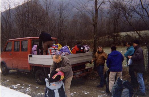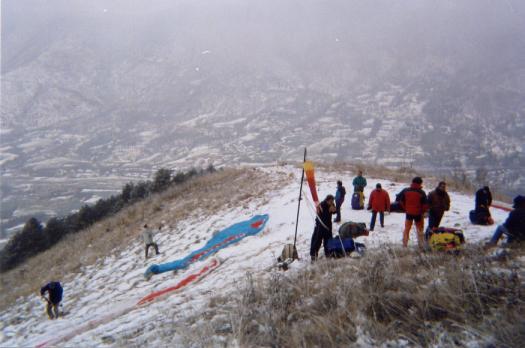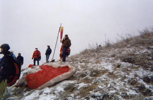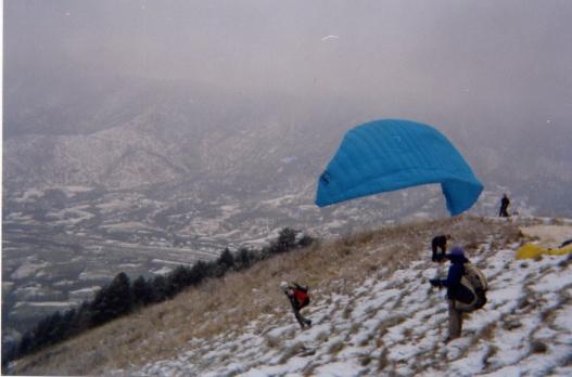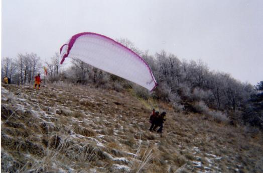 contatto con Guido Teppa, istruttore della scuola di volo Peter Pan di Torino. [Caro Presidente, quando ce lo compri ?] Guido mi aveva avvisato che quasi tutti i loro decolli sono raggiungibili facendo qualche minuto a piedi. Lì avevo mentito spudoratamente dicendo che sono abituato a camminare. Lasciato il furgone, inizia la "passeggiata". Chiedo quanto ci vuole ad arrivare e sentendomi rispondere "tre quarti d'ora circa" ho un lieve e impercettibile mancamento. [In cammino tra la neve] Finalmente eccomi in decollo da buon ultimo staccatissimo. Guido mi fa "Sicuro che sei abituato a camminare quando fai parapendio ?". Confesso che il decollo del Serrone si trova a 10 metri dalla strada e scatta una risata generale. ...Eh sì il solito romano scansafatiche. Dopo il briefing d’obbligo, gli allievi cominciano a prepararsi. [Qualcosa mi dice che si partirà all'italiana] [Sì decisamente si parte all'italiana] [Assistenza ai volatili] Ah ecco perchè il buon Guido era salito comodamente senza attrezzatura. Si imbarca come passeggero clandestino e parte. [Passeggero istruttore] Finalmente parto anch'io. Dolce planata di qualche minuto in cui mi godo il volo guardando sotto di me un nuovo paesaggio e atterro pieno di gioia. Tappa al paese dovo una cioccolata calda non me la leva nessuno. A queste latitudini il freddo si sente. Un ringraziamento a Guido per avermi fatto volare nei cieli piemontesi. Un affettuoso saluto agli amici volatili della scuola Peter Pan con l'augurio di ritrovarci sotto qualche cielo, magari a Gioia per la prossima festa.