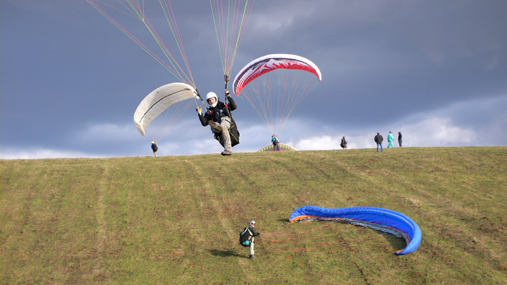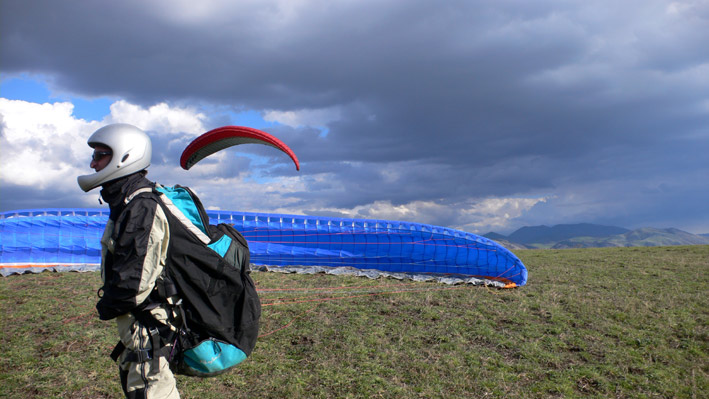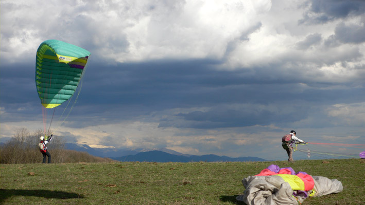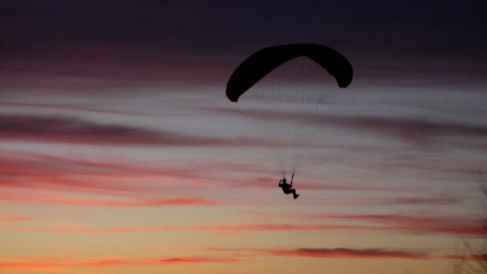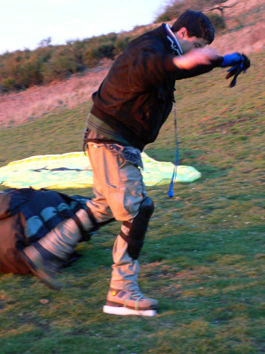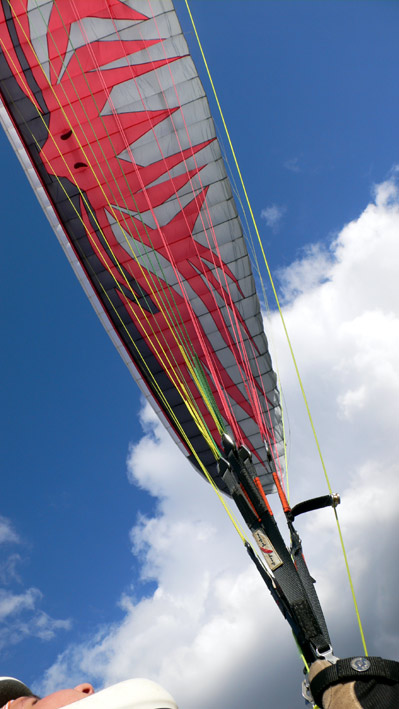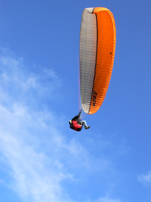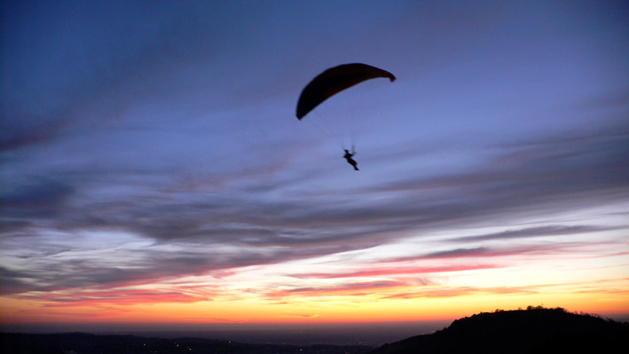 aggiornato il 01 04 2009 [ugo, primo volo - cielo, tramonto multicolore] Primo giorno: mi dicono che non è possibile perché c'è troppo vento… e già lì mi stranisco: era un tiepido venticello di fine maggio …. Per me era una scusa di quei crucchi… ed io che arrivavo addirittura da Roma!!!! Secondo giorno: ci sentiamo per telefono alle 10.00 di mattina ma mi si dice che non è cosa…. Vento storto…. Dobbiamo risentirci alle 15.00…. indovinate? Non è cosa…. Riproviamo verso le 18.00…. non sarebbe cosa ma…. vabbè!! proviamo a vederci in cima alla funivia….. non sarà che gli stanno sulle palle quelli che arrivano da Roma?? Comunque alle 18.20 ci vediamo in cima alla funivia… siamo a 1400 mt di altezza con Tirolo là sotto a 700 metri…. Uno dei due, quello che sembrava il più pratico ed esperto si "acchiappa" Lauren… brevi istruzioni … si imbracano … corsetta e via .. sono già per aria….. Urca!!! Per me, altra delusione… il mio istinto di sopravvivenza prevaricava anche l'amore nei confronti di Lauren, volevo IO il pilota più esperto …. Io non voglio volare… soffro di vertigini… odio l'aereo….che CaZ2O ci sto a fare quassù??? Provo a corrompere il ragazzino che mi vuole a tutti i costi imbracare promettendogli fiumi di birra una volta tornati giù in funivia…. Ma quello - con tutto l'odio nei confronti dei romani - mi "costringe" ad imbracarmi… anche noi corsettina et voilà… per aria…. PERO'!!!!! che fico!!!! Una paura fottuta…. ma fantastico!!! Terzo giorno : Domani ci sarà tempo bellissimo… dicono…. Andremo a 2400 metri ed atterreremo a 700…. Un volo di almeno mezz'ora……. Io e Lauren non stiamo più nella pelle … una emozione grande per un volo che si presenta a dir poco spettacolare…. Tutte le Dolomiti sotto i nostri piedi… chissà come sarà….. noi siamo già in quota ad aspettare i due piloti… ci raggiungeranno alle 14.00 .- Ma … alle 14.00 arriva la telefonata del pilota "esperto" che si scusa ma un imprevisto lo costringe a disertare… viene solo il ragazzino…. - E noi?? Siamo in due!! - Farete un po' per uno….. dice lui…. (gli stanno proprio sulle palle, i romani)……… a questo punto scatta l'odio nei confronti del tipo "esperto" e - inaspettatamente - l'amore per il parapendio… decido di far volare solo Lauren con il ragazzino raccomandandomi di farle fare un volo indimenticabile e decido seduta stante di cercare una volta rientrato a Roma una scuola di parapendio… Io tornerò sicuramente a Merano a volare… ma piloterò io!!!!! Chi mi conosce bene sa della mia cocciutaggine: insisto ed insisto fino a che non riesco ad ottenere il risultato voluto…. Anche a costo di starci chissà quanto tempo…. Da metà ottobre, praticamente tutti i week end, mi sono presentato al campetto: briefing iniziali, imbracature, gonfiaggi…. Rovi e spine….. lezioni di teoria tutti i lunedì sera… sempre presente…. Ho anche fatto due "escursioni" o chiamateli sopralluoghi al decollo alto del campetto con tanto di fiocco per provare a fare il primo stacco… ma in entrambe le occasioni non era cosa… il Signor Maestro mi ha gracchiato nella radio di tornare giù…. Sarà mica imparentato coi crucchi?? Odia anche lui i romani?? Ma io, poi, non sono romano!!!! Ed è arrivato finalmente il giorno giusto: 8 marzo 2009….. In campetto dalle 12.30 mette vento giusto solo verso le 17.00, primo timido approccio sul campetto basso con stacchettino di un paio di metri al più e passaggio a raso sui rovi prima di atterrare…. Dai che ci siamo!!!!! Ed infatti… - ugo, nino e adrian… salite che fate lo stacco!!!! Cuore in gola… intanto perché è una faticaccia arrivare fino a su… e poi l'agitazione…. In cima: panorama ….. tramonto… e un bel venticello frontale….. Primo gonfiaggio goffo e bretelle che scivolano dalle mani… abortito!!!! Sigh!! Riprovo più deciso che mai….. La vela si gonfia… la accompagno sopra la testa… riesco a dare la controllata alla vela…. Tutto ok …. corro….. i piedi si staccano da terra…. WOW!!! Sono in aria… sto volando …. Faccio un grande respiro…. Emozione… trepidazione….. contentezza…. Concentrazione sulle istruzioni impartite dalla radio… Ma io non soffrivo di vertigini??? Fatto il circuito e condotto quasi per mano dalle istruzioni di Maurizio all'atterraggio…. Sono di nuovo coi piedi per terra….. un concentrato puro di adrenalina…. Mi sento gli occhi gonfi di lacrime per l'emozione… il primo istinto è di trattenerle… ma poi perché?? E' stato talmente bello che voglio viverlo in pieno e le lascio uscire…. Mi si appannano gli occhiali…..che gioia!!!! La gioia del puntoevirgola: mi rendo conto di aver vissuto un momento straordinario che è solo l'inizio di una spero lunga avventura…. A caldo l'ho paragonata alla discussione della tesi di laurea… ma sbagliavo… quello è stato un puntoacapo…. Da li nuove avventure… Domenica scorsa è stato come il primo esame dell'università: il via entusiasmante per intraprendere una grande nuova passione…. Per questo puntoevirgola…. Non è finita, ma solo cominciata… e ne voglio ancora e ancora e ancora….